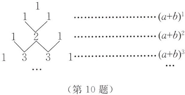 10.【数学文化】我国古代数学的许多发现都曾位居世界前列,其中“杨辉三角”就是一个。如图,这个三角形的构造法则是:两腰上的数都是 1,其余每个数均为其上方左右两数之和,它给出了 $(a + b)^{n}$($n$ 为正整数)的展开式(按 $a$ 的次数由大到小的顺序排列)中各项的系数规律。例如,在三角形中第三行的三个数 1,2,1,恰好对应着 $(a + b)^{2}$ 的展开式中各项的系数;第四行的四个数 1,3,3,1,恰好对应着 $(a + b)^{3}$ 的展开式中各项的系数。