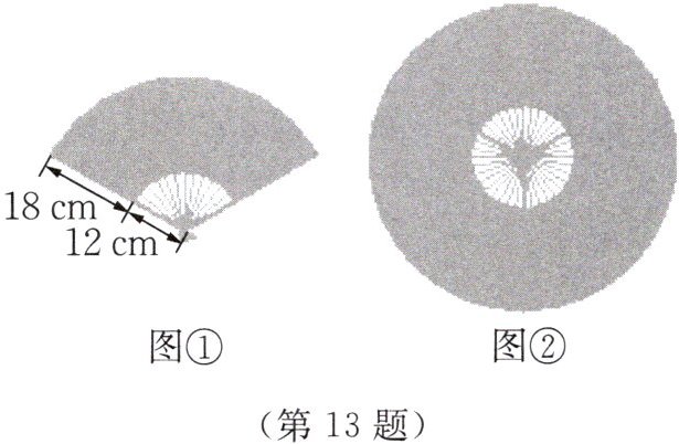 13. 【数学应用】某校编排的一个舞蹈需要五把和图①完全相同的绸扇。学校现有三把符合要求的绸扇,将这三把绸扇完全展开刚好组成如图②所示的一朵圆形的花。求再做两把这样的绸扇至少需要多少平方厘米的绸布。(单面制作,不考虑绸扇的折皱,结果保留$\pi$)