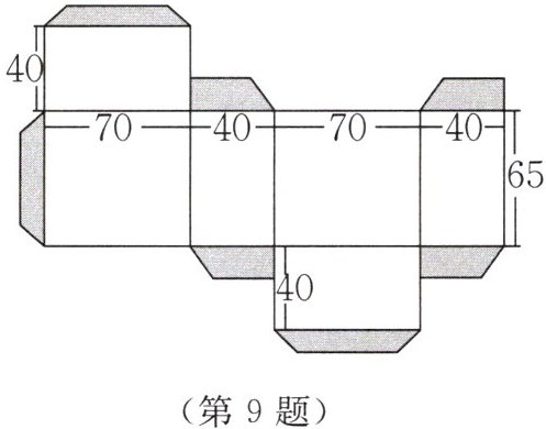 9. 【数学应用】某班数学活动小组的同学们用纸板制作长方体包装盒,其表面展开图和相关尺寸如图所示(单位:mm),其中阴影部分为内部粘贴角料,求此长方体包装盒的体积。
