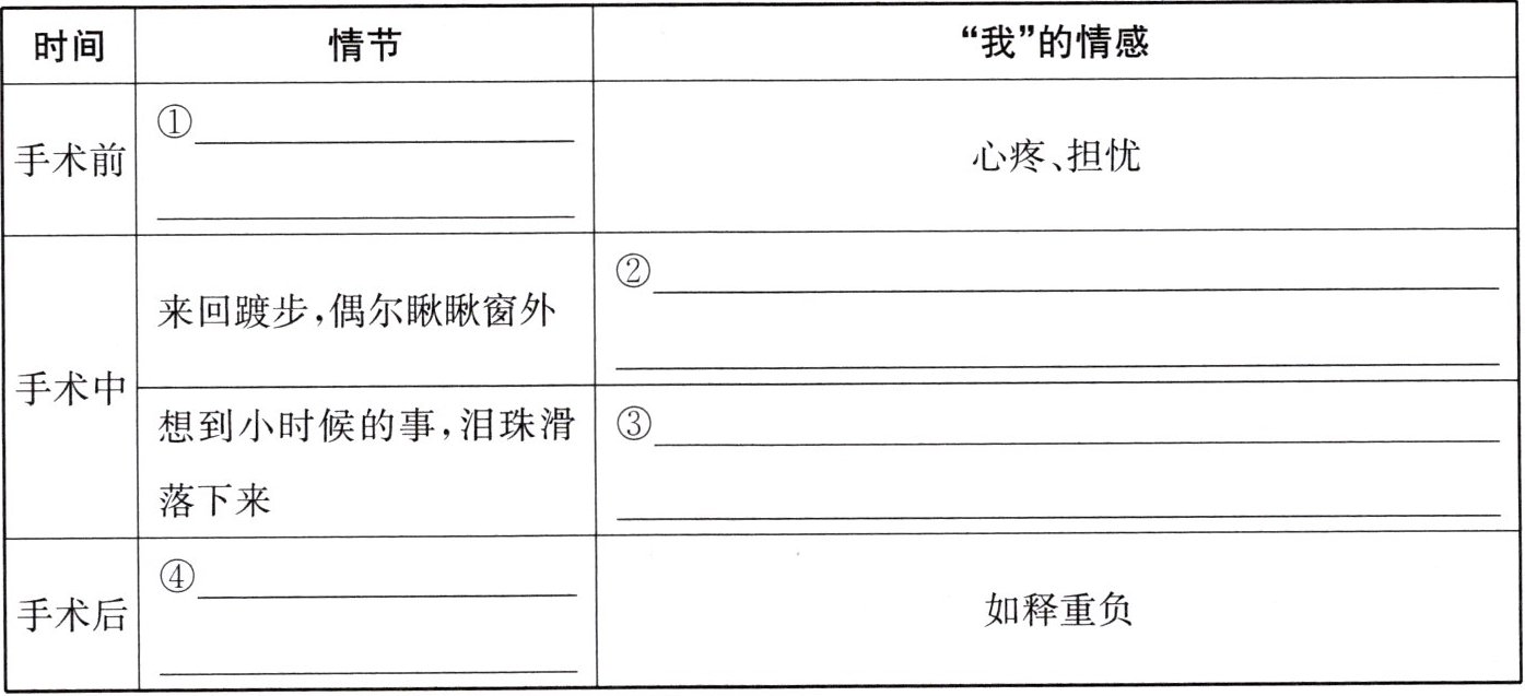 4. 文章以“我”的视角,围绕母亲做手术的事情展开叙述。请依据文章内容,补全下面的表格。