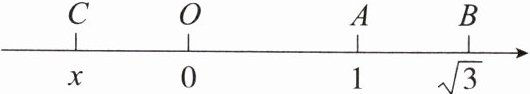 15. (10分)如图,数轴上从左至右依次有 $ C、O、A、B $ 四个点,分别对应的数字为 $ x、0、1 $ 和 $ \sqrt{3} $,且 $ AB= CO $.
