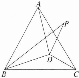 10. (几何直观、推理能力) 如图,$D$ 是等边三角形 $ABC$ 内一点,且 $DB = DA$,$BP = AB$,$\angle DBP= \angle DAC$,求$\angle P$ 的度数。
