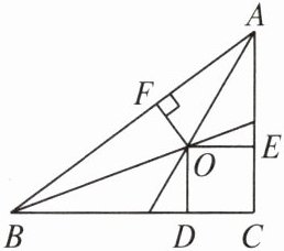 5. 如图,在$\triangle ABC$中,$\angle C = 90^{\circ}$,$O为\triangle ABC$的三条角平分线的交点,$OD\perp BC$,$OE\perp AC$,$OF\perp AB$,点$D$、$E$、$F$分别是垂足,且$AB = 10\mathrm{cm}$,$BC = 8\mathrm{cm}$,$CA = 6\mathrm{cm}$,则点$O到三边AB$、$AC和BC$的距离分别为(