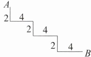 解析:根据题意,得AC = 2 + 2 + 2 = 6,BC = 4 + 4 + 4 = 12,根据勾股定理,得AB = $\sqrt{AC^{2}+BC^{2}}$ = $\sqrt{6^{2}+12^{2}}$ = $\sqrt{180}$.