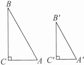 (2)斜边和一条直角边对应成比例;在Rt△ABC和Rt△A'B'C'中,∠C=∠C'=90°,$\frac{AB}{A'B'}=\frac{AC}{A'C'}$;说明如下:设$\frac{AB}{A'B'}=\frac{AC}{A'C'}=k(k>0)$,则AB=kA'B',AC=kA'C';在Rt△ABC和Rt△A'B'C'中,$\frac{BC}{B'C'}=\sqrt{\frac{AB^{2}-AC^{2}}{A'B'^{2}-A'C'^{2}}}=\sqrt{\frac{k^{2}A'B'^{2}-k^{2}A'C'^{2}}{A'B'^{2}-A'C'^{2}}}=k$,