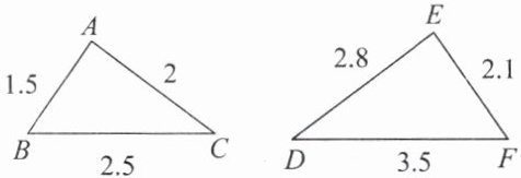 ∵$\frac{AB}{EF}=\frac{1.5}{2.1}=\frac{5}{7}$,$\frac{AC}{DE}=\frac{2}{2.8}=\frac{5}{7}$,$\frac{BC}{DF}=\frac{2.5}{3.5}=\frac{5}{7}$,