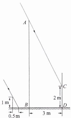 延长AC交直线BD于E,则$\frac{CD}{DE}=\frac{1}{0.5}$,∴DE=1m.∵△ABE∽△CDE,∴$\frac{AB}{CD}=\frac{BE}{DE}$,∴$\frac{AB}{2}=\frac{3+1}{1}$,∴AB=8m.