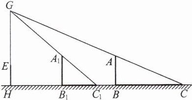 ∴$\frac{A_1B_1}{GH}=\frac{B_1C_1}{HC_1}$.设$B_1C_1$长为xm,则$\frac{1.6}{4.8}=\frac{x}{x+3}$,解得$x=\frac{3}{2}$,即$B_1C_1=\frac{3}{2}$m.