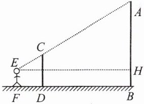 2. 为测量操场上悬挂国旗的旗杆高度,设计的测量方案如图所示:标杆高度 $ CD = 3m $,标杆与旗杆的水平距离 $ BD = 15m $,人的眼睛与地面的高度 $ EF = 1.6m $,人与标杆 $ CD $ 的水平距离 $ DF = 2m $,$ E $,$ C $,$ A $ 三点共线,则旗杆 $ AB $ 的高度为