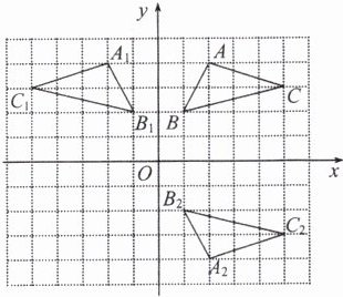 (2)分别标出$A_1,B_1,C_1关于点O的对称点A_2,B_2,C_2$,顺次连结$A_2,B_2,C_2$三点.