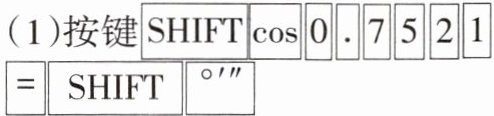 【思路点拨】按键$\boxed{SHIFT}$ $\boxed{MODE}$ (SETUP)$\boxed{3}显示\boxed{D}$,使计算器的角度单位设定为“度”,再按照规定的操作顺序进行。