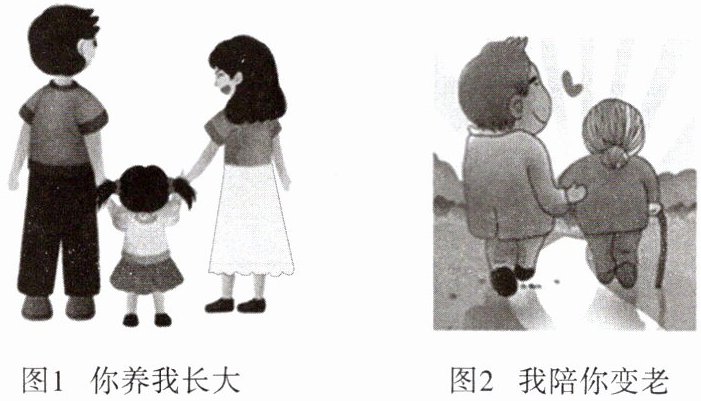 3. 示例:这两幅图描写的是父母与孩子之间的亲情,两幅图上的文字"你养我长大""我陪你变老"照应主题"孝亲敬老",图1是父母养育我们成长的阶段,图2是我们长大后陪伴父母的阶段。如今我们在慢慢长大,父母也在慢慢变老,我们需要做的就是在长大的过程中学着去陪伴、理解、孝顺和关爱父母。