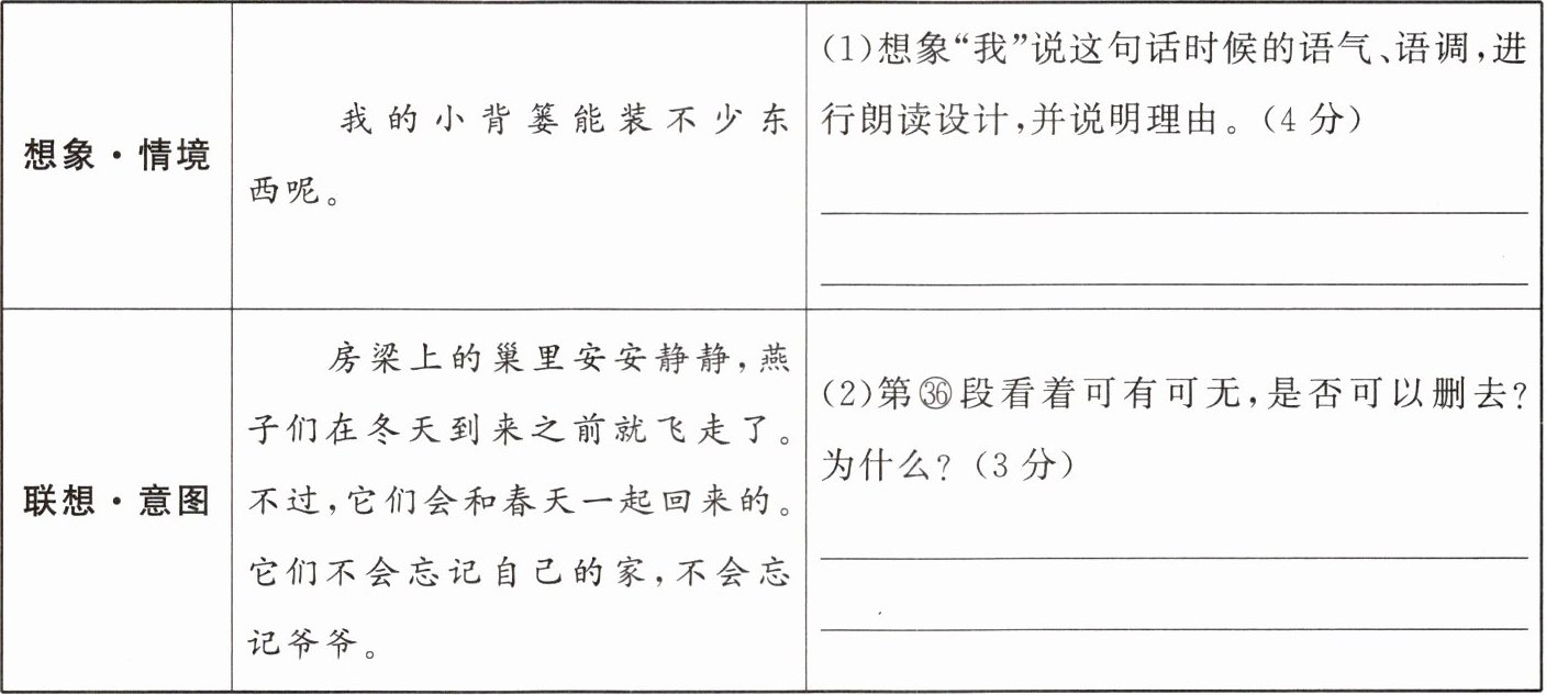 | 联想·意图 | 房梁上的巢里安安静静,燕子们在冬天到来之前就飞走了。不过,它们会和春天一起回来的。它们不会忘记自己的家,不会忘记爷爷。 | (2)第㉟段看着可有可无,是否可以删去?为什么?(3分)