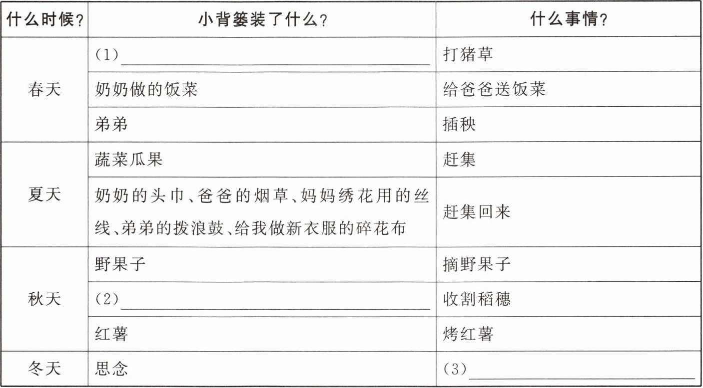 | 夏天 | 奶奶的头巾、爸爸的烟草、妈妈绣花用的丝线、弟弟的拨浪鼓、还有给我做新衣服的碎花布 | 赶集回来 |