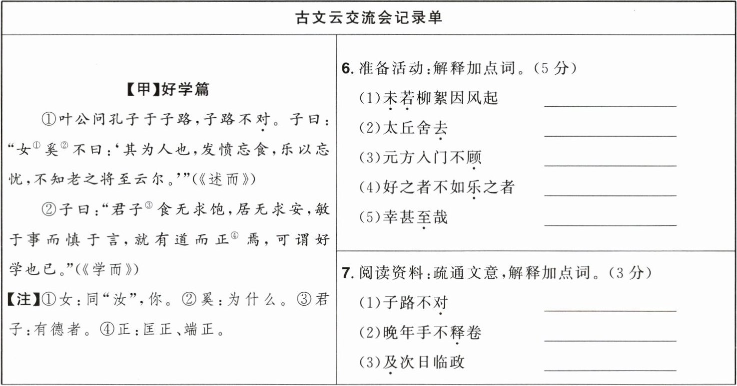 |①叶公问孔子于子路,子路不对。子曰:“女①奚②不曰:‘其为人也,发愤忘食,乐以忘忧,不知老之将至云尔。’”(《述而》)②子曰:“君子③食无求饱,居无求安,敏于事而慎于言,就有道而正④焉,可谓好学也已。”(《学而》)【注】①女:同“汝”,你。②奚:为什么。③君子:有德者。④正:匡正、端正。|7. 阅读资料:疏通文意,解释加点词。(3 分)(1)子路不对 ______(2)晚年手不释卷 ______(3)及次日临政 ______|