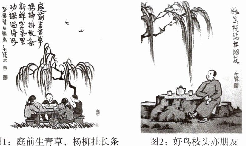 (1)两幅漫画里都选择了青草、杨柳和鸟儿作为意象。这些意象同时出现,使整个画面显得春意盎然、富有生机,人们身处其中,读书、品茶,尽显悠闲自在,富有情趣。丰子恺是想借这些意象表达自己对春天和自然的热爱,对生活的热爱,富有生活情趣。