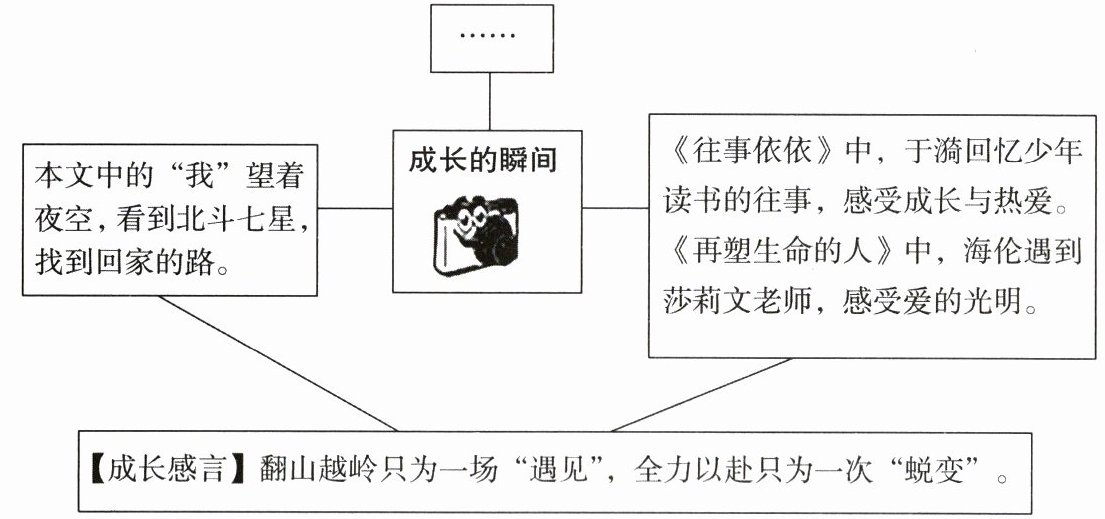 4.(1)看到狗尾巴草、鸟屎、大槐树等 (2)看到夜空 (3)想起老师带“我们”参观天文馆 (4)亲情 5.“浓重如漆”“波浪暗涌”“茫茫无边”应读重音,用沉重的语气,语调逐渐低沉,体现出夜色的浓重,表达“我”不见北斗七星时内心的迷茫与孤独。 6. 示例一:运用比喻的修辞手法,将车窗前闪烁的灯火比作萤火虫,生动形象地刻画出火车在夜色中驰行的场景,暗含了作者对姐姐的不舍和思念之情。 示例二:“飞驰”“闪烁”这些动词描绘了火车在夜色中驰行的场景,“吞没”则表明火车渐行渐远,逐渐消失于夜色之中,暗含了对姐姐离开的不舍、思念和伤感之情。 7. 示例一:我认为小语的成长感言道出了成长是自我和他人的互动。因为遇见借给“我”手绢的同学,“我”收获了纯真的友谊;因为有家人的疼爱与关心,“我”收获了温暖的亲情。在迷茫的时候,能找到北斗七星,获得精神指引。这些都使“我”不断成长、蜕变。正如于漪小时候遇到的山水画、《水浒传》《千家诗》,以及上学时期两位国文老师的朗诵等,这些美好的经历激发了她对读书的喜爱、对老师的感激、对家乡和祖国的热爱。作者这样一步步对文学产生了兴趣,一步步接受文学的熏陶,积累了丰厚的文学积淀,为后来成为一代名师奠定了坚实的基础。 示例二:我认为小语的成长感言道出了成长是自我和他人的互动。因为遇见借给“我”手绢的同学,“我”收获了纯真的友谊;因为有家人的疼爱与关心,“我”收获了温暖的亲情。在迷茫的时候,能找到北斗七星,获得精神指引。这些都使“我”不断成长、蜕变。海伦在遇见莎莉文老师之前无助而迷茫,莎莉文老师耐心地教海伦写字、认识“水”、理解万物名称背后的意义,这成为海伦成长的转折点。但她的成长亦因自身的坚强乐观,如坚持完成学业、支持慈善事业、获得文学成就等,她不断突破自己,实现蜕变。