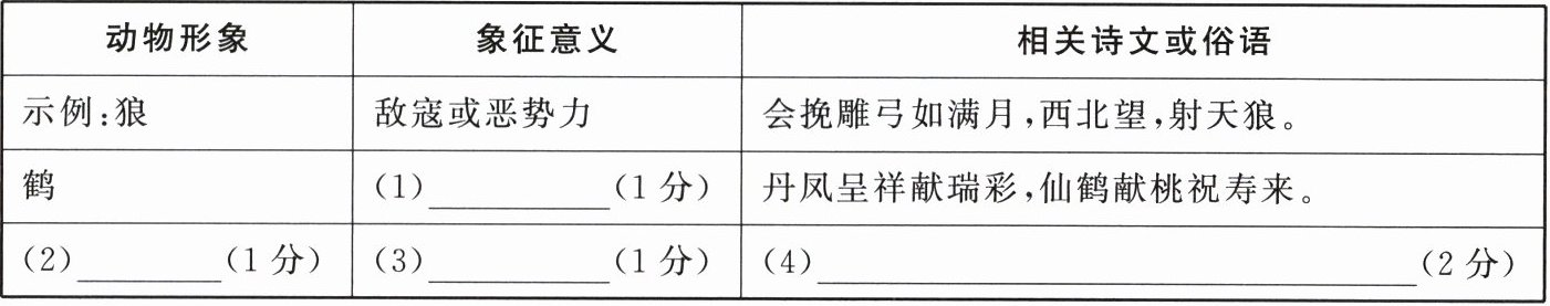 11. 中华传统文化中许多动物都具有象征意义,甚至已成为独特的文化符号。请根据示例,完成填空。(5分)