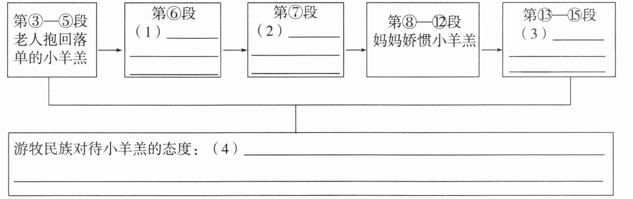 | 第③—⑤段老人抱回落单的小羊羔 | 第⑥段(1)_________ | 第⑦段(2)_________ | 第⑧—⑫段妈妈娇惯小羊羔 | 第⑬—⑮段(3)_________ |