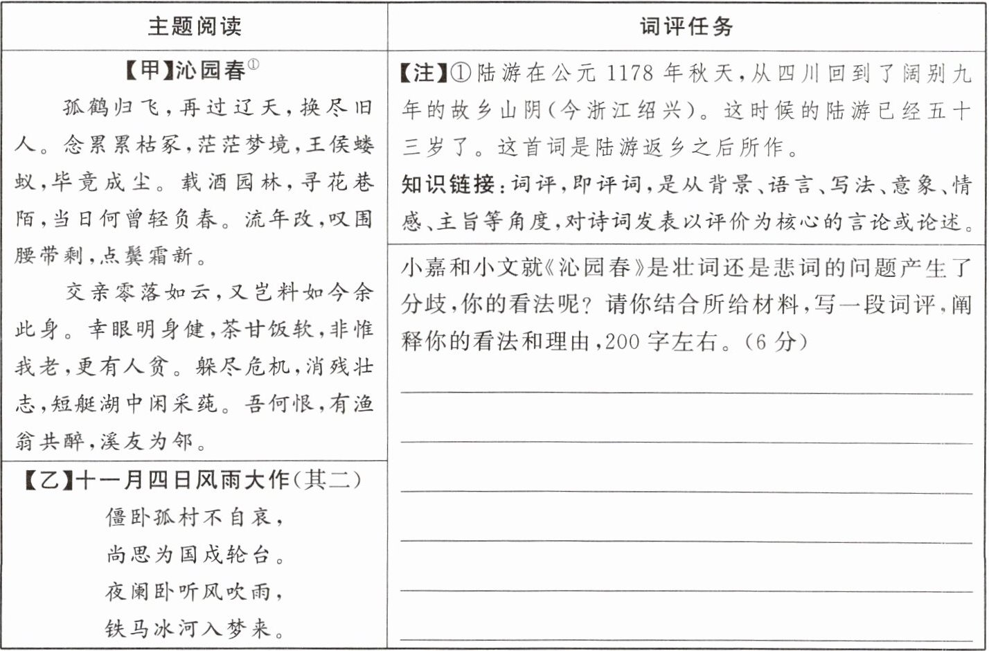 6.学校的星耀文学社开展以“追寻悲壮的爱国魂”为主题的词评活动,小嘉和小文都锁定了陆游,请你结合所选的作品,帮忙完成词评任务。(6 分)