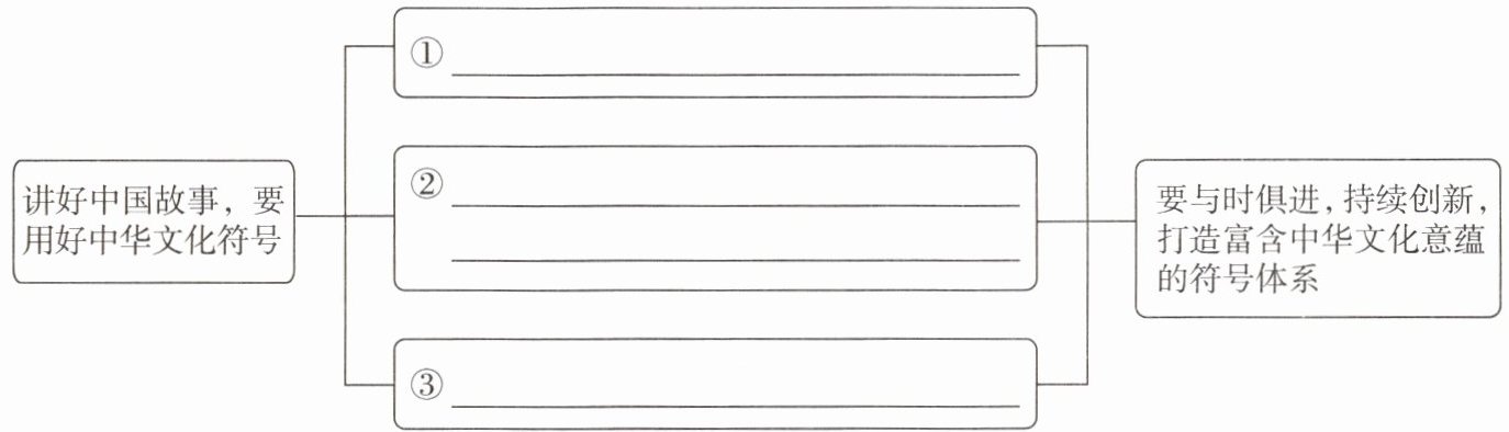 7. ①用文化符号讲中国故事,既要传承,又要创新②让符号富含中华文化意蕴,需兼顾国内外受众需求③我们还应用好新媒体,增强文化符号的影响力 8. 位置不可互换。理由:【甲】句以《猛龙过江》《卧虎藏龙》等电影突出“中国功夫”传播中国文化为例,有力地证明了“要用好传统文化符号,讲好中华传统文化的故事”的观点;【乙】句以兔年春晚典籍中的上古神兽从VR画师笔下一跃而出和非遗南音与流行音乐结合为例,有力地证明了“应与时俱进,不断丰富文化符号的种类,增加文化符号的时代内涵”的观点。 9. 示例:从典籍中发掘中华民族的文化密码,勇于创新,以“文化节目+戏剧+影视化”的方式讲述中华传统文化故事。