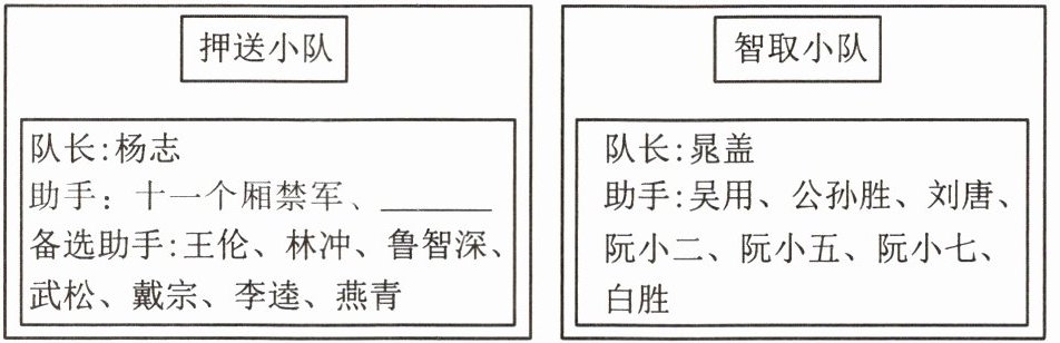 | 队长:杨志助手:十一个厢禁军、备选助手:王伦、林冲、鲁智深、武松、戴宗、李逵、燕青 | 队长:晁盖助手:吴用、公孙胜、刘唐、阮小二、阮小五、阮小七、白胜 |