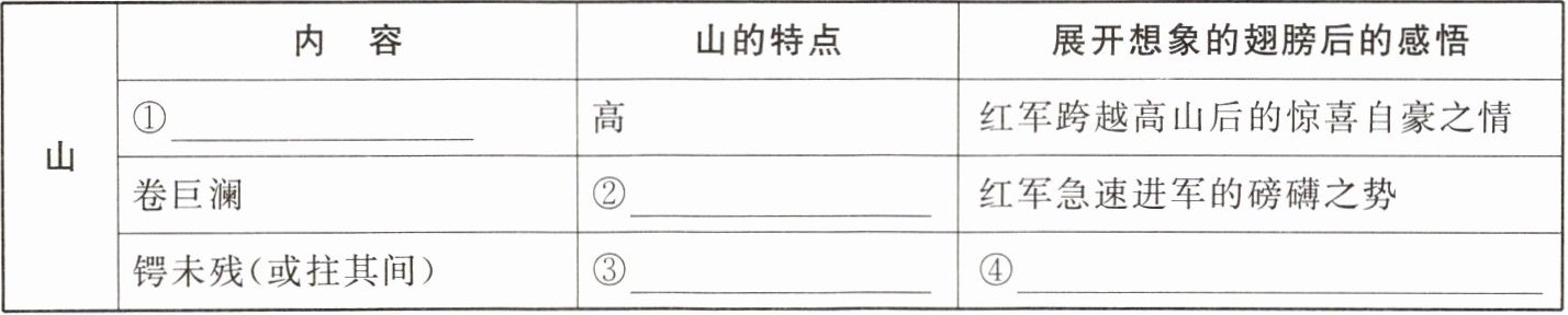| 卷巨澜 | ②______ | 红军急速进军的磅礴之势 |