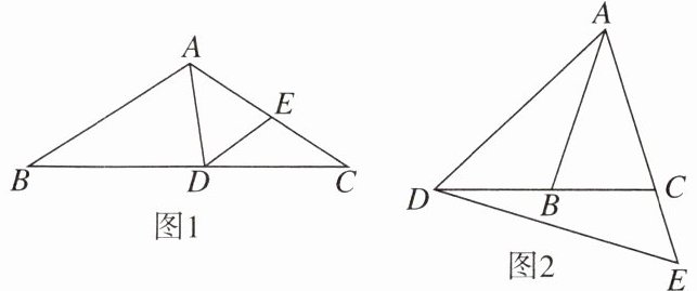 13. 如图,在△ABC中,AB=AC,点D在BC所在的直线上,点E在射线AC上,且AD=AE,连结DE。