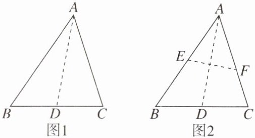 【变式 2】小明将三角形纸片 ABC(AB>AC)沿过点 A 的直线折叠,使得 AC 落在 AB 边上,折痕为 AD,展开纸片(如图 1);再次折叠该三角形纸片,使点 A 和点 D 重合,折痕为 EF,展平纸片后得到△AEF(如图 2)。小明认为△AEF 是等腰三角形,你同意他的说法吗?请你说明理由。