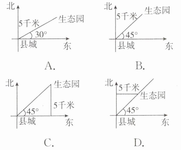 3. 生态园位于县城东北方向5千米处,下列各图表示准确的是(