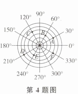 4. 下左图是雷达探测到的6个目标,若目标B用(30,60°)表示,目标F用(40,330°)表示,则表示为(50,210°)的目标是(