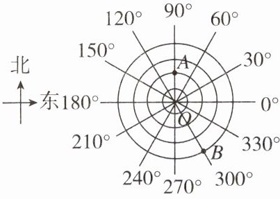 (2)如果点A,B在平面内的位置分别记为A(5,30),B(12,120),试求A,B两点之间的距离并画出图形。
