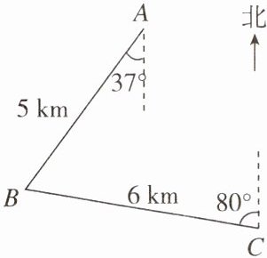 (1)由图知,A处在B处的北偏东37°方向,距离B处5 km处;C处在B处的南偏东80°方向,距离B处6 km处。