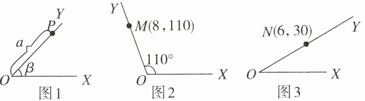 11. 如图1,将射线OX按逆时针方向旋转β度,得到射线OY,如果点P为射线OY上的一点,且OP= a,那么我们规定用(a,β)表示点P在平面内的位置,并记为P(a,β)。例如,图2中,如果OM= 8,∠XOM= 110°,那么点M在平面内的位置记为M(8,110)。根据图形,解答下面的问题。