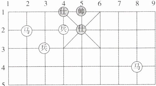 5. 中国象棋历史悠久,战国时期就有关于它的正式记载,观察下图所示的象棋棋盘,我们知道,行“马”的规则是走“日”字对角(图中向上为进,向下为退),如果“帅”的位置记为(5,1),“马2退1”后的位置记为(1,4)(表示第2列的“马”向下走“日”字对角到达第1列的位置),那么“马8进7”后的位置可记为(