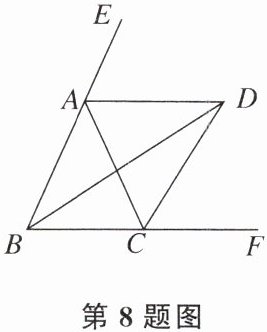 8. 如图,∠ABC= ∠ACB,AD,BD,CD分别平分△ABC的外角∠EAC、内角∠ABC、外角∠ACF,有以下结论:①AD//BC,②∠ACB= ∠ADB,$③∠ADC+∠ABD= 90°,$$④∠ADB= 45°-∠CDB,$其中正确的结论有(
