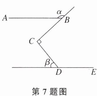 7. 如图,若AB//DE,BC⊥CD,α,β是两个角的度数,则下列说法正确的是(