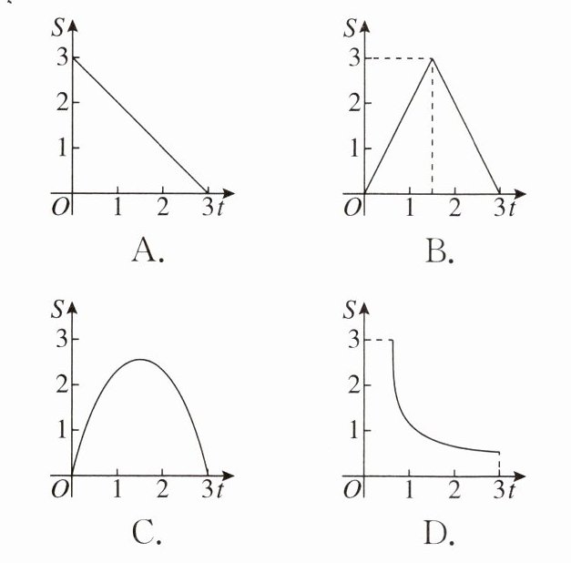 9. 如图,在$\triangle ABC$中,$\angle B= 90^{\circ}$,$AB= 3\ cm$,$BC= 6\ cm$,动点$P从点A$出发,沿$AB向点B$以1 cm/s的速度移动,动点$Q从点B$出发,沿$BC向点C$以2 cm/s的速度移动。若$P$,$Q两点分别从A$,$B$两点同时出发,当点$P到达点B$时两点同时停止运动,则$\triangle PBQ的面积S与出发时间t$的函数关系图象大致是 ( )