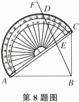 8. 如图,在Rt△ABC中,∠CAB= 36°,斜边AC与量角器的直径重合(点A的刻度为0),将射线BF绕着点B转动,与量角器的外圆弧交于点D,与AC交于点E,若△ABE是等腰三角形,则点D在量角器上对应的刻度为( )