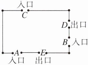 4. 如图,某景区有 A,B,C 三个入口,D,E 两个出口,小红任选一个入口进入景区,游玩后任选一个出口离开,则她选择从 A 或 B 入口进入,从 D 出口离开的概率是(