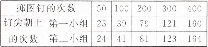 8. 研究“掷一个图钉,钉尖朝上”的概率,两个小组用同一个图钉做试验进行比较,他们的统计数据如下表: