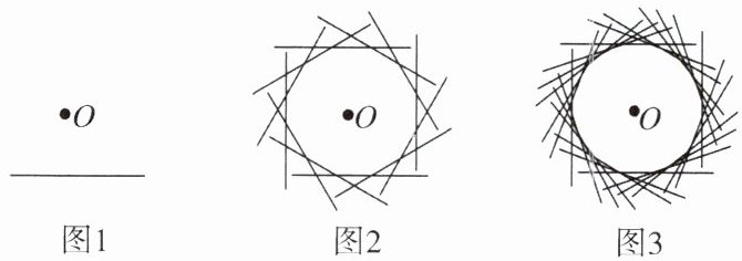 8. 聪聪用铅笔在一张白纸上点了一点 O,然后拿起一把直尺,平放在纸上,让尺子的一条边贴住这个点 O,用铅笔沿直尺的另一边画了一条直线(如图 1),聪聪又把尺子换了位置,用刚才的方法接着画出了第二条直线、第三条直线……(如图 2),慢慢地中间出现了一个圆(如图 3).请说说聪聪用直尺画圆的道理是______.