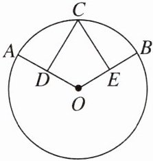 证明:如图,连结OC.$\because CD\perp OA$于点D,CE$\perp OB$于点E,$\therefore \angle CDO=\angle CEO=90^\circ$.$\because OC=OC$,$OD=OE$,$\therefore \triangle COD\cong \triangle COE(HL)$,$\therefore \angle AOC=\angle BOC$,$\therefore \overset{\frown}{AC}=\overset{\frown}{BC}$,$\therefore$C是$\overset{\frown}{AB}$的中点.