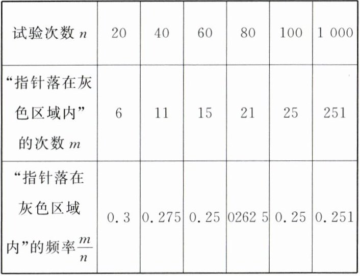 13. 某试验小组做了可转动转盘(如图),想求当转盘停止转动后,“指针落在灰色区域内”的概率,试验数据如下表: