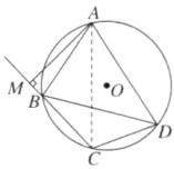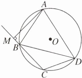 12. 如图,四边形 $ABCD$ 内接于$\odot O$,$AM\perp CB$交 $CB$ 的延长线于点 $M$,$BA$ 平分$\angle MBD$,连结 $BD$,若 $AM = 4$,$AD= 4\sqrt{3}$,则 $MC$ 的长为______.