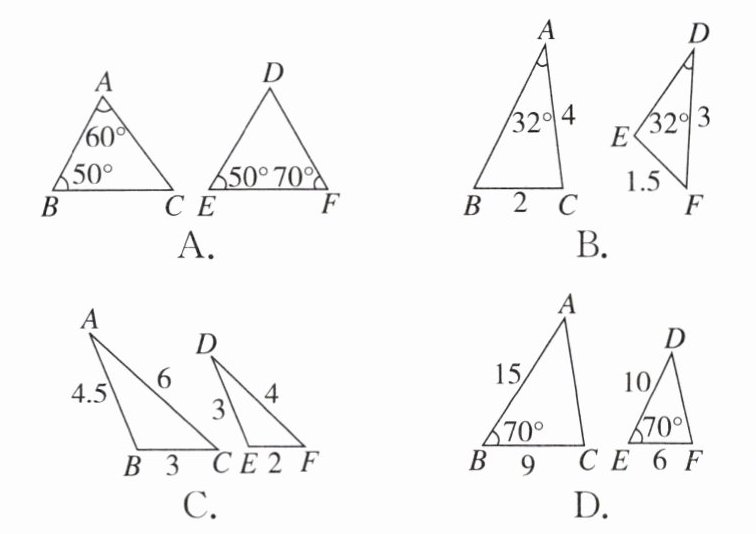 3. 下列所给四对三角形中,根据条件不能判定△ABC 与△DEF 相似的是 (