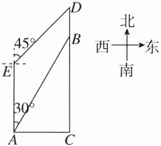 22.(10分)如图,三角形花园ABC紧临湖泊,四边形ABDE是沿湖泊修建的人行步道.经测量,点C在点A的正东方向,AC= 200米,点E在点A的正北方向,点B,D在点C的正北方向,BD= 100米,点B在点A的北偏东30°方向,点D在点E的北偏东45°方向.