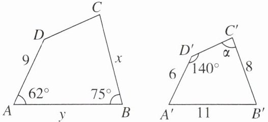 7. 如图,四边形ABCD∽四边形A'B'C'D',四边形ABCD中,∠A= 62°,∠B= 75°,AD= 9,BC= x,AB= y;四边形A'B'C'D'中,∠D'= 140°,A'D'= 6,A'B'= 11,B'C'= 8,∠C'= α,则边x= ______,y= ______,α= ______.