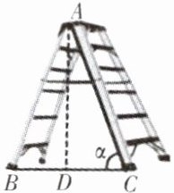 7. 如图,人字梯 $ AB $,$ AC $ 的长都为 2 m.当$ \alpha=50^{\circ} $时,人字梯顶端距地面的高度 $ AD $ 约是______m.(结果精确到0.1 m,参考数据:$ \sin 50^{\circ}\approx0.77 $,$ \cos 50^{\circ}\approx0.64 $,$ \tan 50^{\circ}\approx1.19 $)