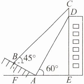 9. 如图,某建筑物的顶部有一块宣传牌CD,小明在山坡的坡脚A处测得宣传牌底部D的仰角为60°,沿山坡向上走到B处测得宣传牌顶部C的仰角为45°,已知斜坡AB的坡角为30°,AB= 10米,AE= 15米,则宣传牌CD的高度是( )